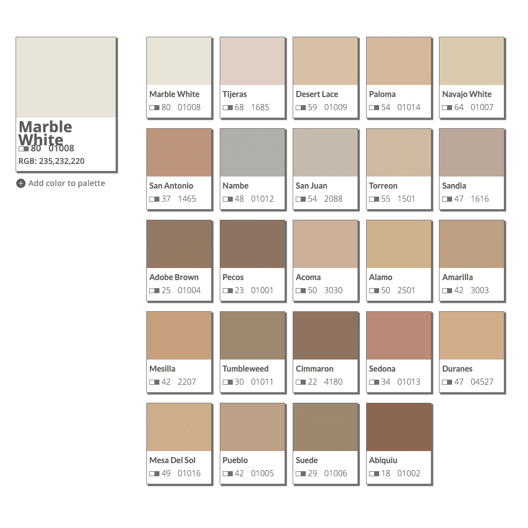 These colors are a guideline. Individual stucco providers may have different names for the same color, and slightly different colors with the same name.